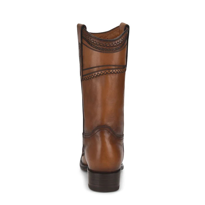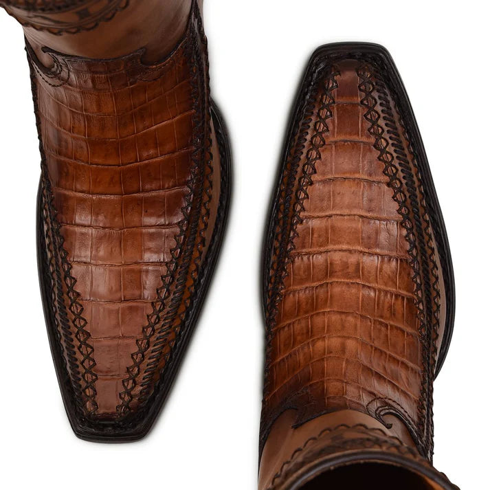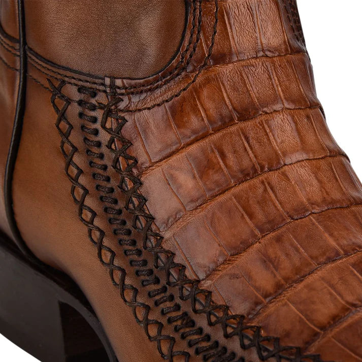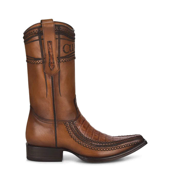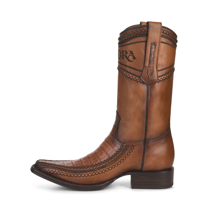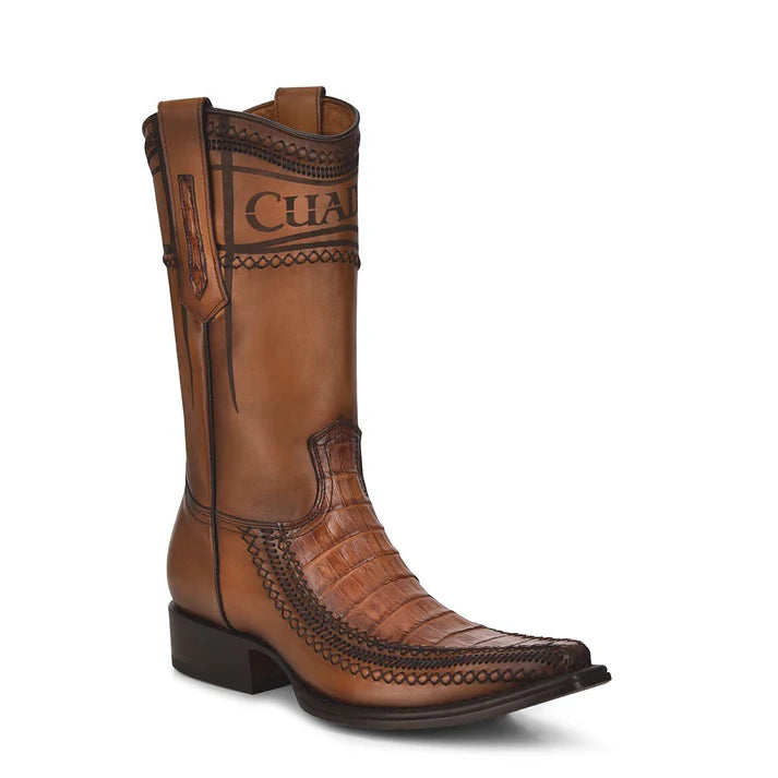 Traditional men's boot in genuine caiman and bovine leather. It features laser engraving of the Cuadra logo on the front and hand-woven details.